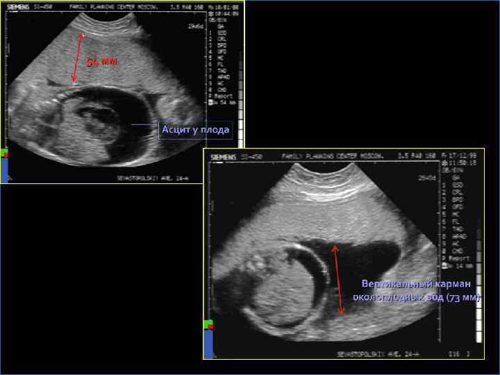 УЛЬТРАЗВУКОВАЯ ДИАГНОСТИКА Ранние признаки иммунной водянки плода – многоводие, гепатоспленомегалия, генерализованный отек При выраженной водянке плода: § Гидроперикард § Асцит и гидроторакс в сочетании с многоводием – очень неблагоприятный прогностический признак § Кардиомегалия § Отек кожи головы и конечностей § Плохая сократимость и утолщение стенки желудочков сердца § Увеличение эхогенности кишечника из-за отека его стенок § Гипертрофированная плацента, гомогенность плаценты § Необычная поза плода - «поза Будды» - позвоночник и конечности отведены от раздутого живота § Снижение двигательной активности