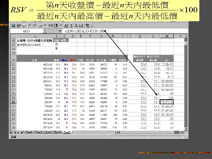 語法 OFFSET(reference, rows, cols, height, width) e. g. , OFFSET(C 30, 0, 0, -9, 1) <-> C 22: C 30 MAX(OFFSET(C 30, 0, 0, -9, 1)) <-> MAX(C 22: C 30) 最近九天內最高價