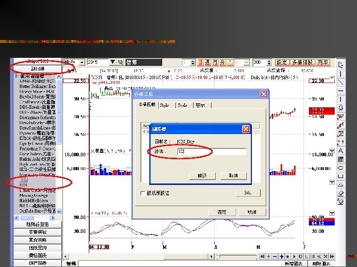 自建KD “副指標” (ps: ignore “J”) 若欲更改n值(e. g: 查詢最佳值為 12), 可進Sniper將此數值改為 12, or 進” 副指標”將”語法”改為 12(見下頁) 畫K-D圖 也可delete Draw 3, 此時僅顯示 KD線 撰寫完畢存檔 檔案 全部檢查 (打圈)