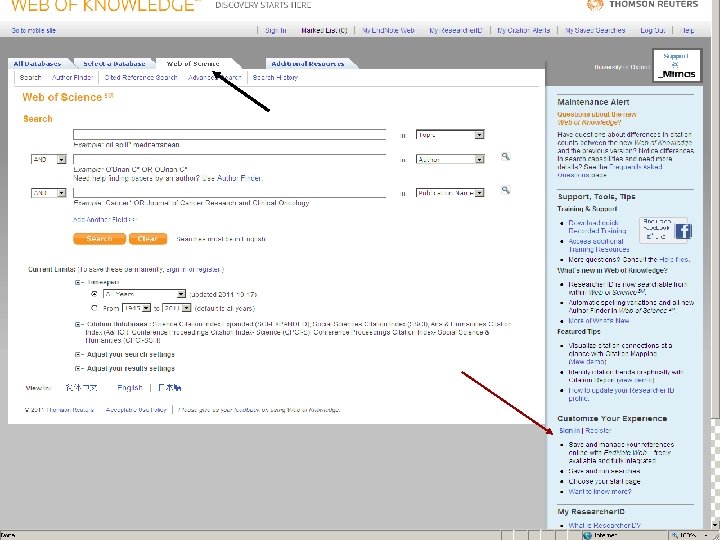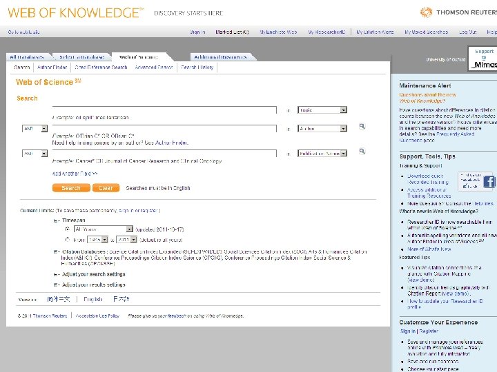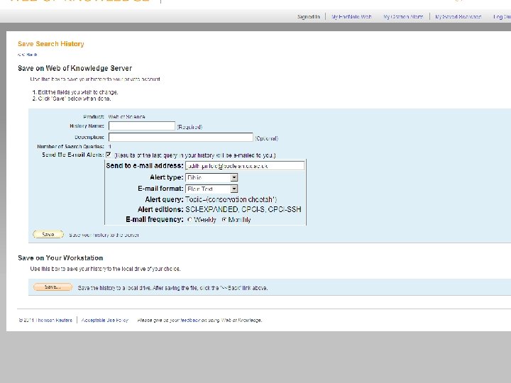 Web of Knowledge Three ways to keep up to date: E-mail alert – you can specify a search to be repeated and the results emailed to you at chosen intervals Saving and rerunning searches – you save a search and run it again in the future Citation Alert – you will receive an email every time a particular article is cited in another Wo. K-indexed article