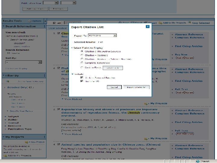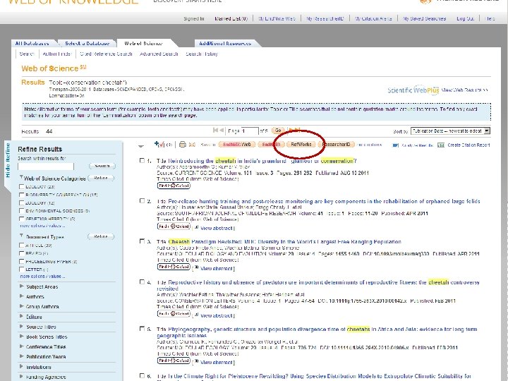 Bibliographic Databases Search : - Conservation of Cheetahs 2006 -2011 Scopus = 44 articles W. o. K. = 43 articles Ovid = 63 after de-duplication of 75 articles, etc. Pro. Quest = 36 articles Total = 227 After Ref. Works de-duplication = 77