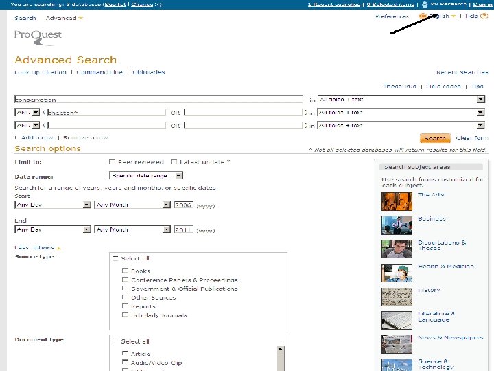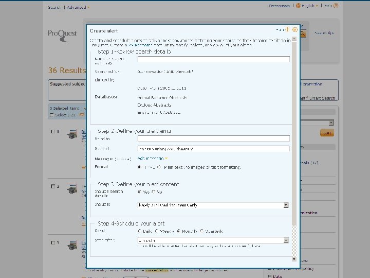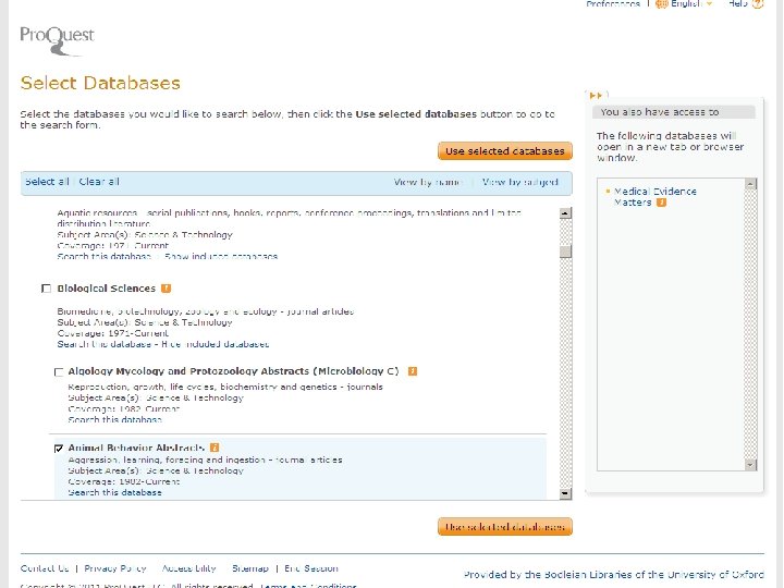 Bibliographic Databases Pro. Quest • Very broad based • ‘Biological science’ component concentrates on: Biomedicine, biotechnology, zoology and ecology journal articles • Coverage 1971 -current • 29 databases including: Ecology abstracts, Entomology abstracts, Animal behaviour abstracts, Plant Science, etc. • Can search individually or by specific databases • Updated monthly