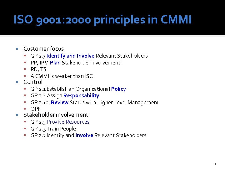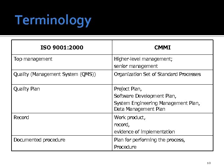 Terminology ISO 9001: 2000 CMMI Top management Higher-level management; senior management Quality (Management System (QMS)) Organization Set of Standard Processes Quality Plan Project Plan, Software Development Plan, System Engineering Management Plan, Data Management Plan Record Work product, record, evidence of implementation Documented procedure Plan for performing the process, Procedure 10