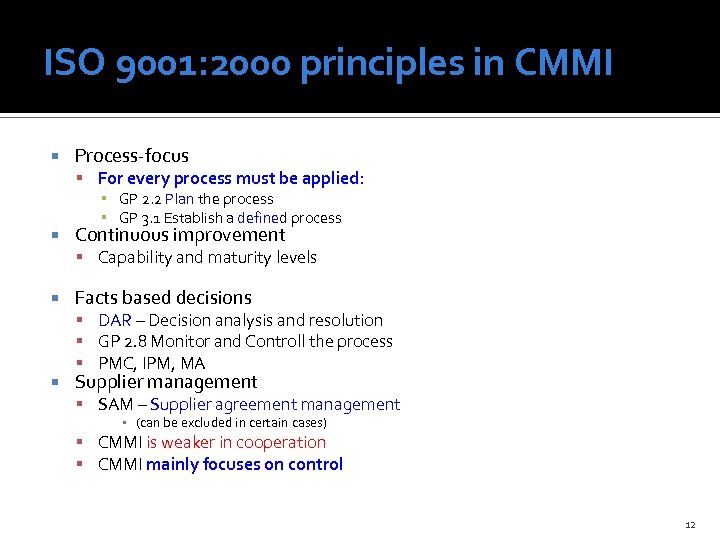 ISO 9001: 2000 principles in CMMI Customer focus GP 2. 7 Identify and Involve Relevant Stakeholders PP, IPM Plan Stakeholder Involvement RD, TS A CMMI is weaker than ISO GP 2. 1 Establish an Organizational Policy GP 2. 4 Assign Responsability GP 2. 10, Review Status with Higher Level Management OPF Control Stakeholder involvement GP 2. 3 Provide Resources GP 2. 5 Train People GP 2. 7 Identify and Involve Relevant Stakeholders 11