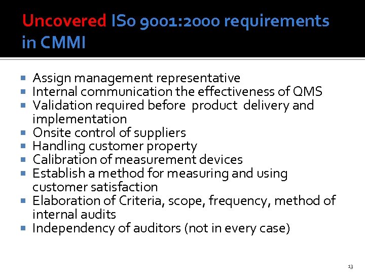 Uncovered IS 0 9001: 2000 requirements in CMMI Assign management representative Internal communication the effectiveness of QMS Validation required before product delivery and implementation Onsite control of suppliers Handling customer property Calibration of measurement devices Establish a method for measuring and using customer satisfaction Elaboration of Criteria, scope, frequency, method of internal audits Independency of auditors (not in every case) 13