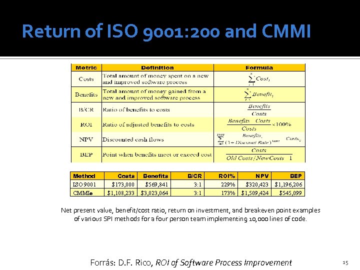 Return of ISO 9001: 200 and CMMI Method Costs Benefits B/CR ROI% NPV BEP ISO 9001 CMMI® $173, 000 $1, 108, 233 $569, 841 $3, 023, 064 3: 1 229% 173% $320, 423 $1, 509, 424 $1, 196, 206 $545, 099 Net present value, benefit/cost ratio, return on investment, and breakeven point examples of various SPI methods for a four person team implementing 10, 000 lines of code. Forrás: D. F. Rico, ROI of Software Process Improvement 15