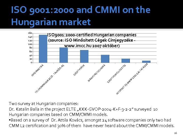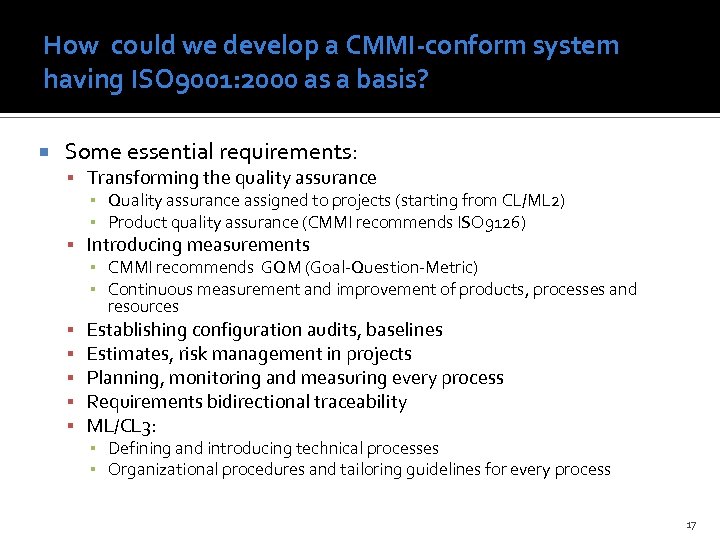 ISO 9001: 2000 and CMMI on the Hungarian market 160 140 120 100 80 60 40 20 0 LG ÁL T ES FE SZ O ER W FT V ÉS W W SZ O YÍ ÁN IR JL TÁ ST EC SZ O AT ÁS O ZT É S KA EK ER FT V HN I T NE TE R IN TE LE KO M M UN IK ÁC I Ó IN -T FO ÁV K RM Ö AT ZL ÁS IK A K ISO 9001: 2000 -certified Hungarian companies (source: ISO Minősített Cégek Címjegyzéke www. imcc. hu 2007 október) Two survey at Hungarian companies: Dr. Katalin Balla in the project ELTE „KKK-GVOP-2004 -K+F-3 -2 -2” surveyed 10 Hungarian companies based on CMM/CMMI models. • Based on a survey of Dr. Attila Kovács, amongst 24 software companies only two had CMM L 2 certification and 30% of them have never heard about the CMM/CMMI models. 16