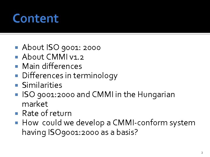 Content About ISO 9001: 2000 About CMMI v 1. 2 Main differences Differences in terminology Similarities ISO 9001: 2000 and CMMI in the Hungarian market Rate of return How could we develop a CMMI-conform system having ISO 9001: 2000 as a basis? 2