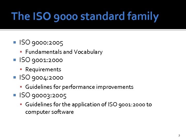 The ISO 9000 standard family ISO 9000: 2005 Fundamentals and Vocabulary ISO 9001: 2000 Requirements ISO 9004: 2000 Guidelines for performance improvements ISO 90003: 2005 Guidelines for the application of ISO 9001: 2000 to computer software 3