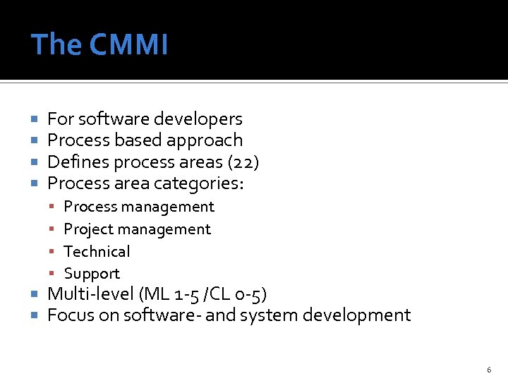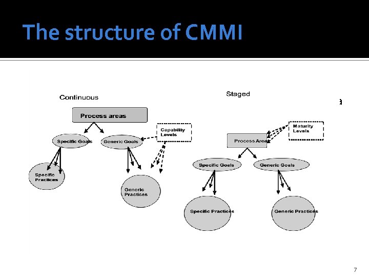 The CMMI For software developers Process based approach Defines process areas (22) Process area categories: Process management Project management Technical Support Multi-level (ML 1 -5 /CL 0 -5) Focus on software- and system development 6