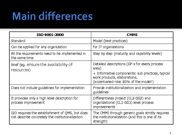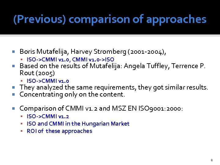 (Previous) comparison of approaches Boris Mutafelija, Harvey Stromberg (2001 -2004), ISO->CMMI v 1. 0, CMMI v 1. 0 ->ISO Based on the results of Mutafelija: Angela Tuffley, Terrence P. Rout (2005) ISO->CMMI v 1. 0 They analyzed the same requirements, they got similar results. Concentrating only on the content. Comparison of CMMI v 1. 2 and MSZ EN ISO 9001: 2000: ISO->CMMI v 1. 2 ISO and CMMI in the Hungarian Market ROI of these approaches 8