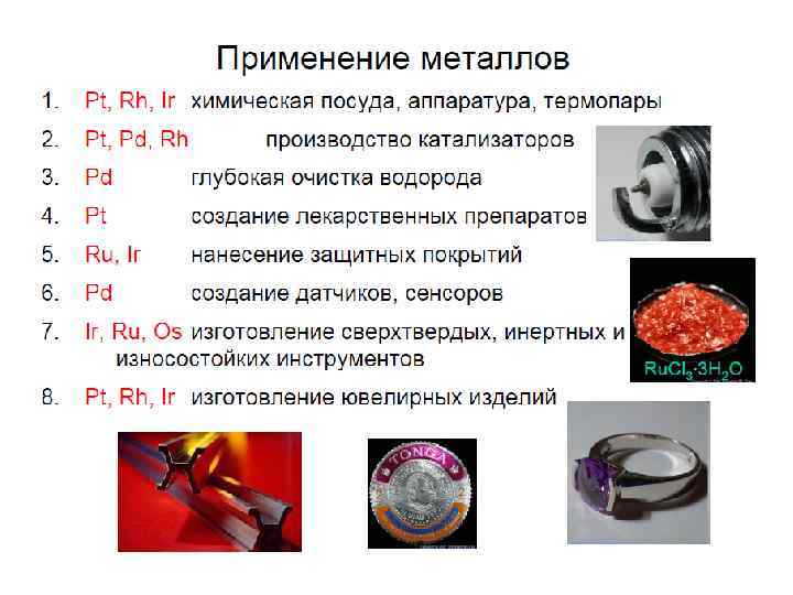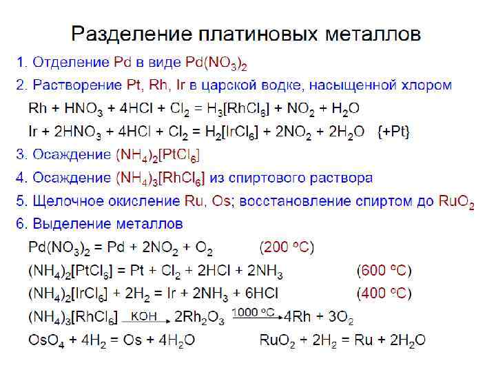 Химические свойства • Окисление кислородом (кроме Pt) до оксидов Os. O 4, Ru. O 2, Rh 2 O 3, Ir. O 2, Pd. O • Окисление фтором до (Ru, Os, Pt)F 6 , (Rh, Ir)F 5 и Pd. F 4 • Не растворяются в кислотах и щелочах в отсутствие окислителей