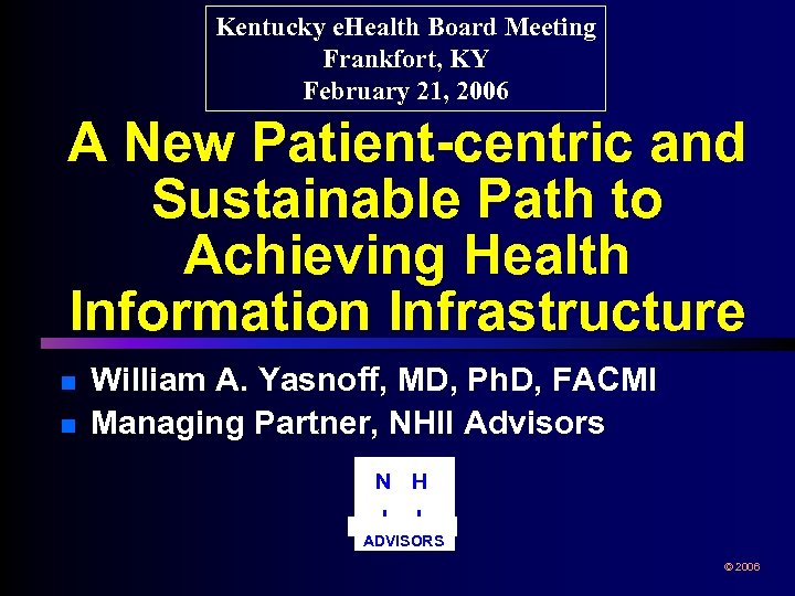 Kentucky e. Health Board Meeting Frankfort, KY February 21, 2006 A New Patient-centric and Sustainable Path to Achieving Health Information Infrastructure n n William A. Yasnoff, MD, Ph. D, FACMI Managing Partner, NHII Advisors N H I I ADVISORS © 2006