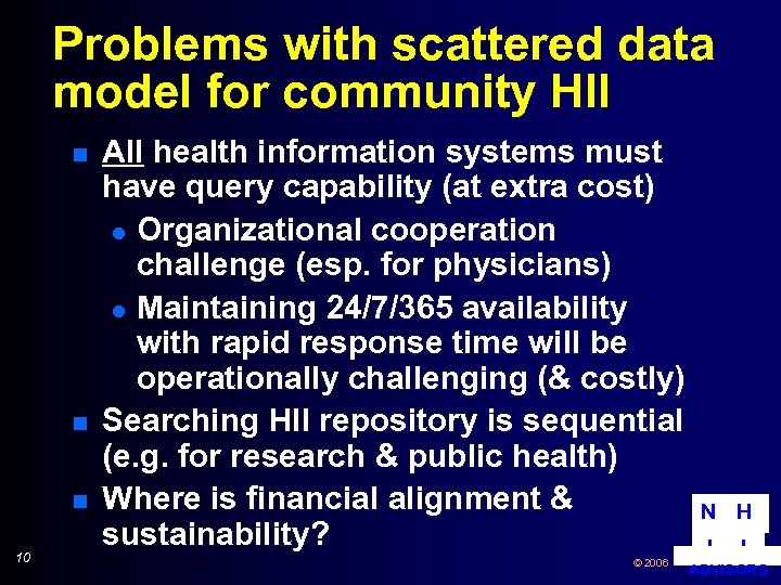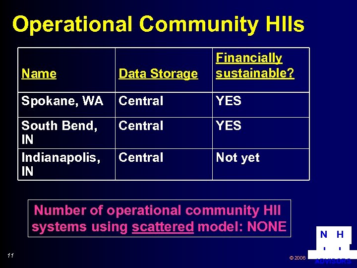Problems with scattered data model for community HII n n n 10 All health information systems must have query capability (at extra cost) l Organizational cooperation challenge (esp. for physicians) l Maintaining 24/7/365 availability with rapid response time will be operationally challenging (& costly) Searching HII repository is sequential (e. g. for research & public health) Where is financial alignment & sustainability? © 2006 N H I I ADVISORS