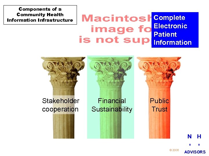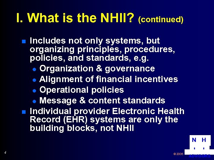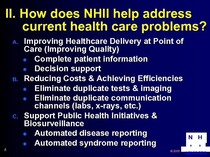 I. What is the NHII? (continued) n n Includes not only systems, but organizing principles, procedures, policies, and standards, e. g. l Organization & governance l Alignment of financial incentives l Operational policies l Message & content standards Individual provider Electronic Health Record (EHR) systems are only the building blocks, not NHII N H 4 © 2006 I I ADVISORS