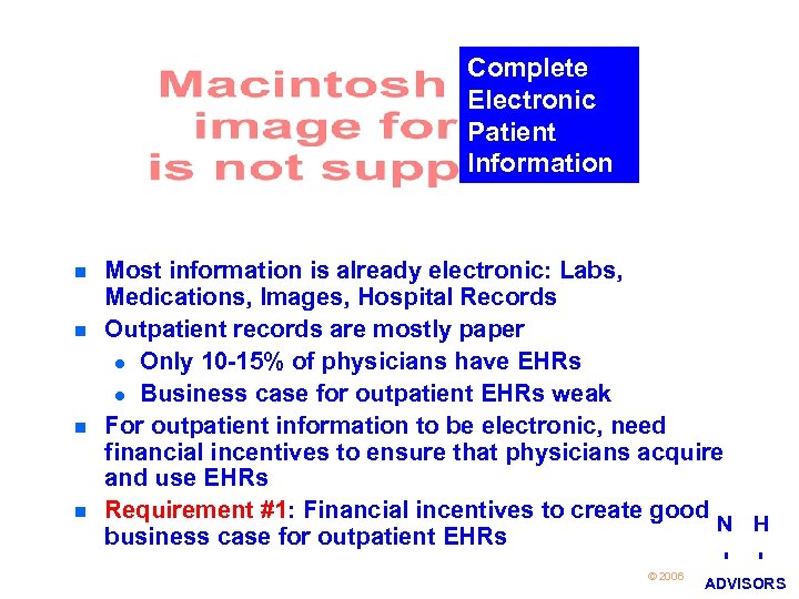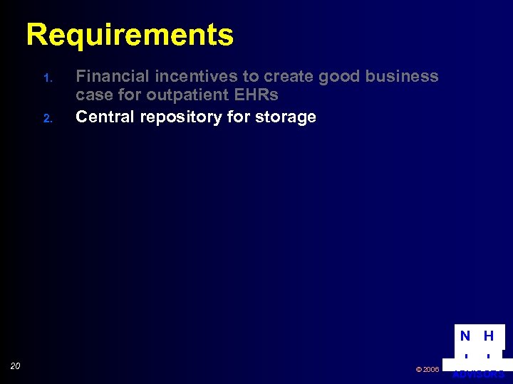 Requirements 1. 2. Financial incentives to create good business case for outpatient EHRs Central repository for storage N H 20 © 2006 I I ADVISORS