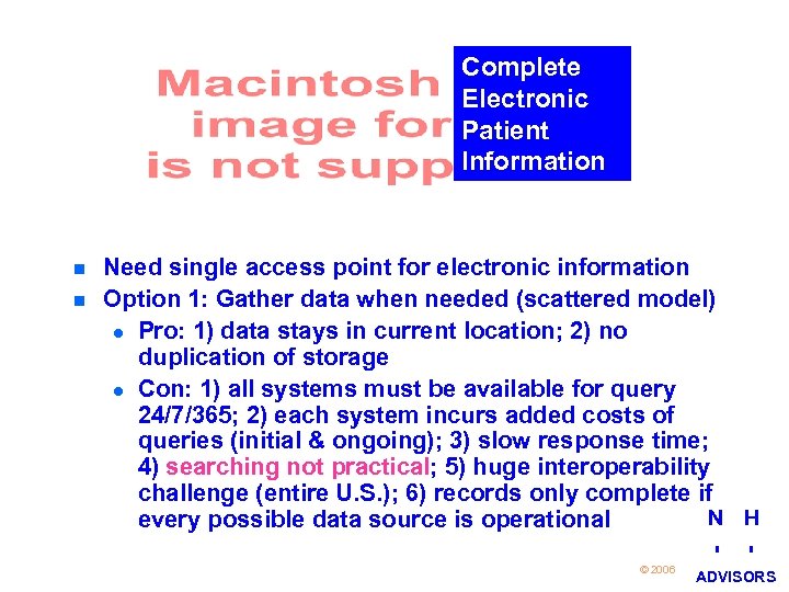 Complete Electronic Patient Information n n 17 Need single access point for electronic information Option 1: Gather data when needed (scattered model) l Pro: 1) data stays in current location; 2) no duplication of storage l Con: 1) all systems must be available for query 24/7/365; 2) each system incurs added costs of queries (initial & ongoing); 3) slow response time; 4) searching not practical; 5) huge interoperability challenge (entire U. S. ); 6) records only complete if N H every possible data source is operational © 2006 I I ADVISORS