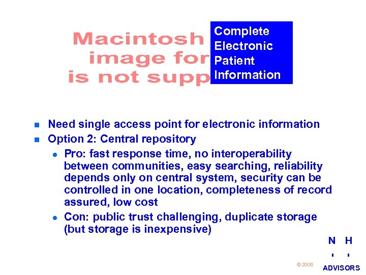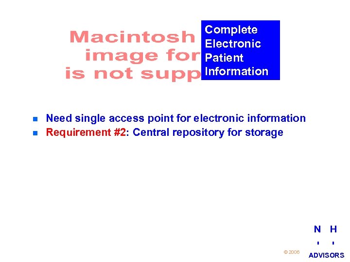 Complete Electronic Patient Information n n Need single access point for electronic information Requirement #2: Central repository for storage N H 19 © 2006 I I ADVISORS