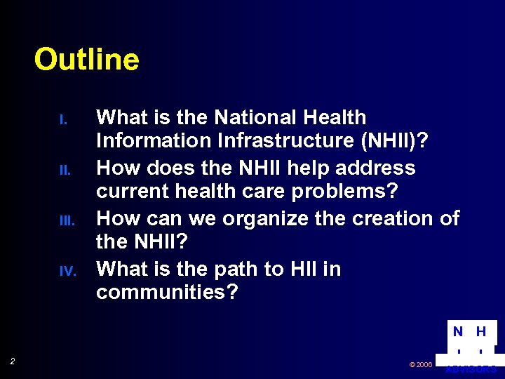 Outline I. III. IV. What is the National Health Information Infrastructure (NHII)? How does the NHII help address current health care problems? How can we organize the creation of the NHII? What is the path to HII in communities? N H 2 © 2006 I I ADVISORS