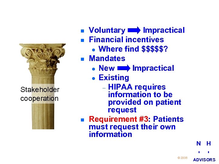 n n n Stakeholder cooperation n Voluntary Impractical Financial incentives l Where find $$$$$? Mandates l New Impractical l Existing – HIPAA requires information to be provided on patient request Requirement #3: Patients must request their own information N H 21 © 2006 I I ADVISORS