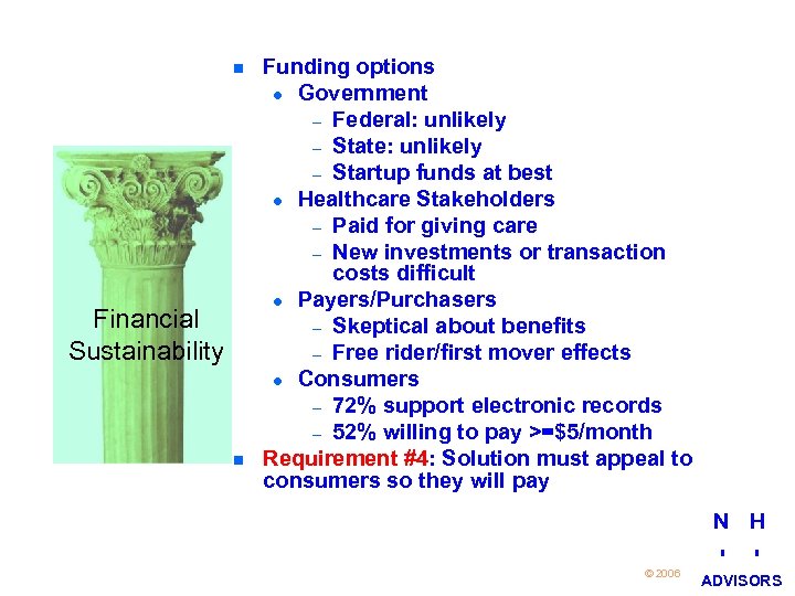 n Financial Sustainability n Funding options l Government – Federal: unlikely – State: unlikely – Startup funds at best l Healthcare Stakeholders – Paid for giving care – New investments or transaction costs difficult l Payers/Purchasers – Skeptical about benefits – Free rider/first mover effects l Consumers – 72% support electronic records – 52% willing to pay >=$5/month Requirement #4: Solution must appeal to consumers so they will pay N H 23 © 2006 I I ADVISORS