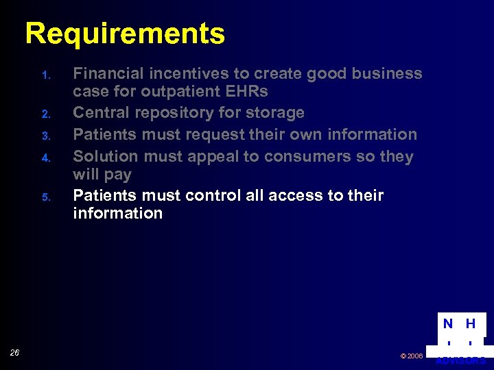 Requirements 1. 2. 3. 4. 5. Financial incentives to create good business case for outpatient EHRs Central repository for storage Patients must request their own information Solution must appeal to consumers so they will pay Patients must control all access to their information N H 26 © 2006 I I ADVISORS