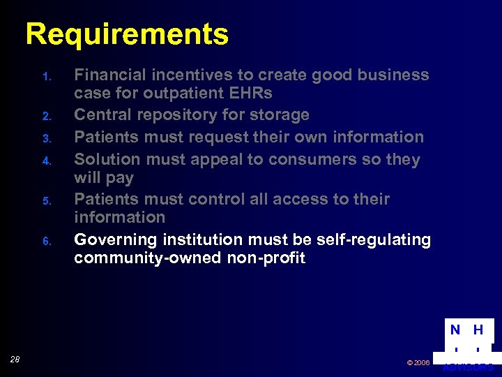 Public Trust B. Trusted Institution § Via regulation (like banks) impractical § Self-regulated § Community-owned non-profit § Board with all key stakeholders § Independent privacy oversight § Open & transparent § Requirement #6: Governing institution must be self-regulating communityowned non-profit N H 27 © 2006 I I ADVISORS