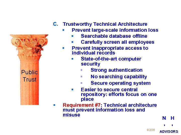 Public Trust 29 C. Trustworthy Technical Architecture § Prevent large-scale information loss § Searchable database offline § Carefully screen all employees § Prevent inappropriate access to individual records § State-of-the-art computer security § Strong authentication § No searching capability § Secure operating system § Easier to secure central repository: efforts focus on one place § Requirement #7: Technical architecture must prevent information loss and misuse © 2006 N H I I ADVISORS