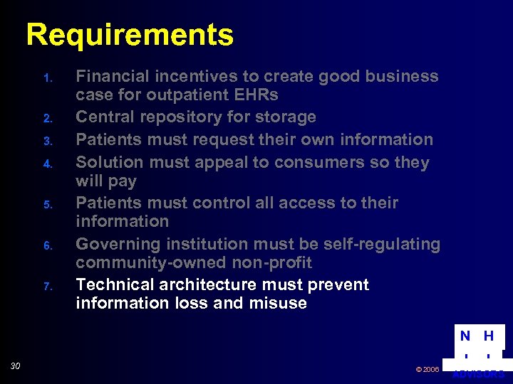 Requirements 1. 2. 3. 4. 5. 6. 7. Financial incentives to create good business case for outpatient EHRs Central repository for storage Patients must request their own information Solution must appeal to consumers so they will pay Patients must control all access to their information Governing institution must be self-regulating community-owned non-profit Technical architecture must prevent information loss and misuse N H 30 © 2006 I I ADVISORS