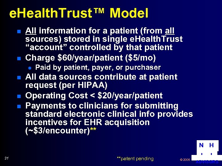 e. Health. Trust™ Model n n All information for a patient (from all sources) stored in single e. Health. Trust “account” controlled by that patient Charge $60/year/patient ($5/mo) l n n n Paid by patient, payer, or purchaser All data sources contribute at patient request (per HIPAA) Operating Cost < $20/year/patient Payments to clinicians for submitting standard electronic clinical info provides incentives for EHR acquisition (~$3/encounter)** N H 31 **patent pending © 2006 I I ADVISORS