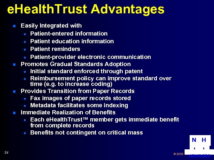 e. Health. Trust Advantages n n Easily Integrated with l Patient-entered information l Patient education information l Patient reminders l Patient-provider electronic communication Promotes Gradual Standards Adoption l Initial standard enforced through patent l Reimbursement policy can improve standard over time (e. g. to increase coding) Provides Transition from Paper Records l Fax images of paper records stored l Metadata facilitates some indexing Immediate Realization of Benefits l Each e. Health. Trust™ member gets immediate benefit from complete records l Benefits not contingent on critical mass N H 34 © 2006 I I ADVISORS