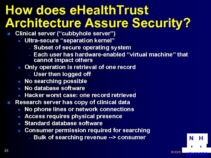 How does e. Health. Trust Architecture Assure Security? n n 35 Clinical server (“cubbyhole server”) l Ultra-secure “separation kernel” – Subset of secure operating system – Each user has hardware-enabled “virtual machine” that cannot impact others l Only operation is retrieval of one record – User then logged off l No searching possible l No database software l Hacker worst case: one record retrieved Research server has copy of clinical data l No phone lines or network connections l Access requires physical presence l Standard database software l Consumer permission required for searching – Bulk of searching revenue --> consumer N H © 2006 I I ADVISORS