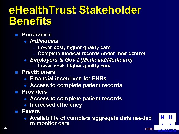 e. Health. Trust Stakeholder Benefits n Purchasers l Individuals – – l Employers & Gov’t (Medicaid/Medicare) – n n n 36 Lower cost, higher quality care Complete medical records under their control Lower cost, higher quality care Practitioners l Financial incentives for EHRs l Access to complete patient records Providers l Access to complete patient records l Increased efficiency Payers l Availability of complete aggregate data needed to monitor care © 2006 N H I I ADVISORS