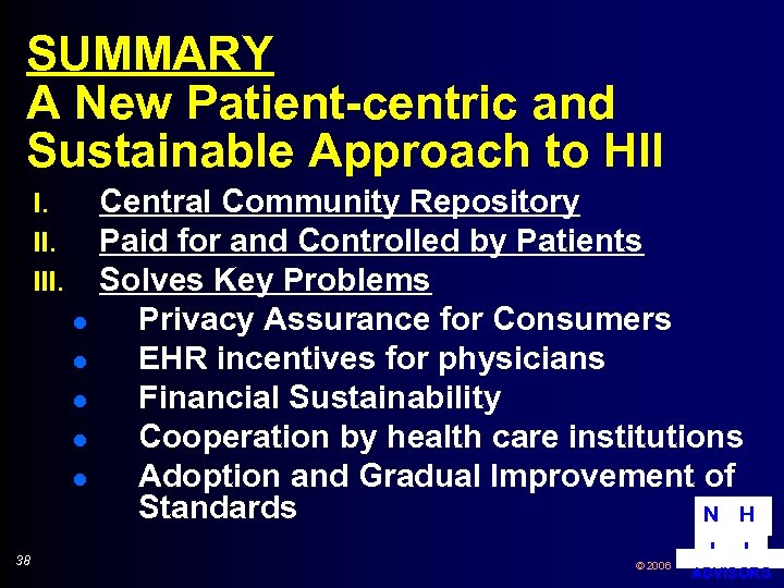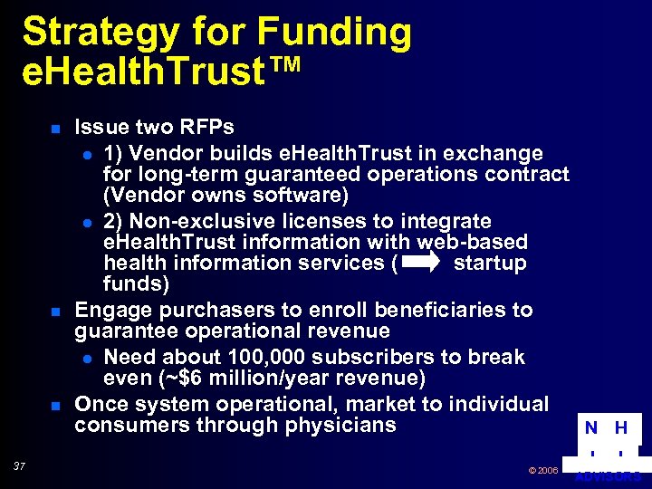 Strategy for Funding e. Health. Trust™ n n n 37 Issue two RFPs l 1) Vendor builds e. Health. Trust in exchange for long-term guaranteed operations contract (Vendor owns software) l 2) Non-exclusive licenses to integrate e. Health. Trust information with web-based health information services ( startup funds) Engage purchasers to enroll beneficiaries to guarantee operational revenue l Need about 100, 000 subscribers to break even (~$6 million/year revenue) Once system operational, market to individual consumers through physicians N H © 2006 I I ADVISORS