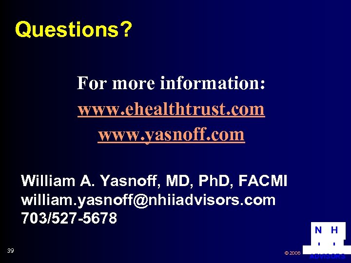 Questions? For more information: www. ehealthtrust. com www. yasnoff. com William A. Yasnoff, MD, Ph. D, FACMI william. yasnoff@nhiiadvisors. com 703/527 -5678 39 © 2006 N H I I ADVISORS