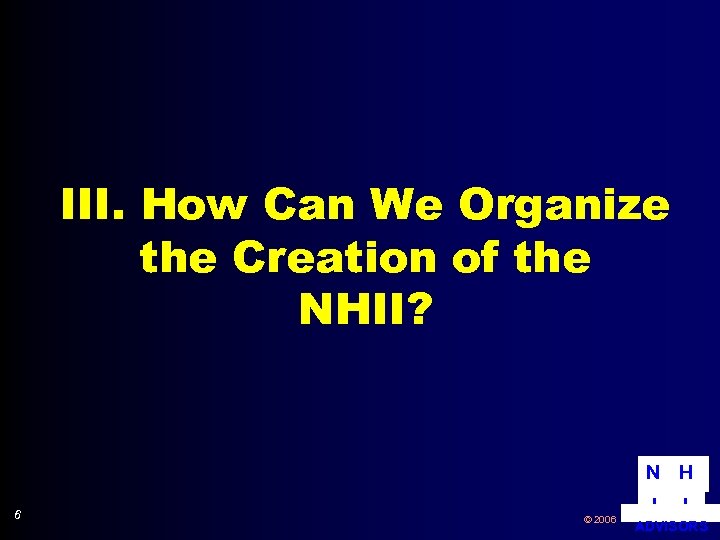 II. How does NHII help address current health care problems? A. B. C. 5 Improving Healthcare Delivery at Point of Care (Improving Quality) l Complete patient information l Decision support Reducing Costs & Achieving Efficiencies l Eliminate duplicate tests & imaging l Eliminate duplicate communication channels (labs, x-rays, etc. ) Support Public Health Initiatives & Biosurveillance l Automated disease reporting l Automated syndrome reporting © 2006 N H I I ADVISORS