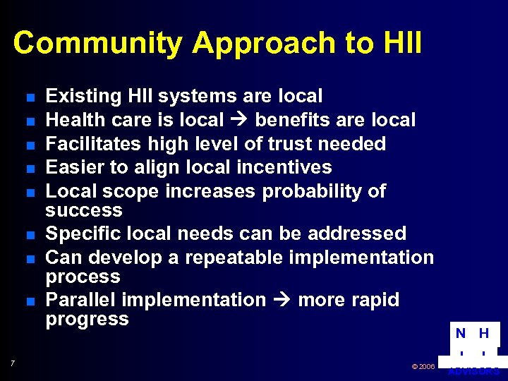 Community Approach to HII n n n n 7 Existing HII systems are local Health care is local benefits are local Facilitates high level of trust needed Easier to align local incentives Local scope increases probability of success Specific local needs can be addressed Can develop a repeatable implementation process Parallel implementation more rapid progress © 2006 N H I I ADVISORS