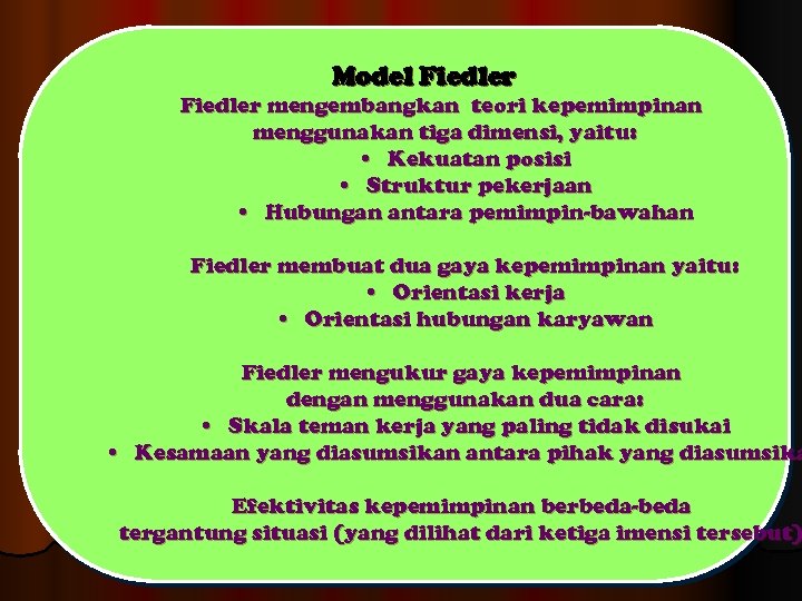 Model Fiedler mengembangkan teori kepemimpinan menggunakan tiga dimensi, yaitu: • Kekuatan posisi • Struktur pekerjaan • Hubungan antara pemimpin-bawahan Fiedler membuat dua gaya kepemimpinan yaitu: • Orientasi kerja • Orientasi hubungan karyawan Fiedler mengukur gaya kepemimpinan dengan menggunakan dua cara: • Skala teman kerja yang paling tidak disukai • Kesamaan yang diasumsikan antara pihak yang diasumsika Efektivitas kepemimpinan berbeda-beda tergantung situasi (yang dilihat dari ketiga imensi tersebut)