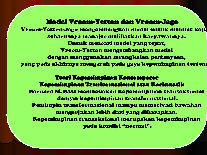 Model Vroom-Yetton dan Vroom-Jago Vroom-Yetton-Jago mengembangkan model untuk melihat kapa seharusnya manajer melibatkan karyawannya. Untuk mencari model yang tepat, Vroom-Yetton mengembangkan model dengan menggunakan serangkaian pertanyaan, yang pada akhirnya mengarah pada gaya kepemimpinan tertent Teori Kepemimpinan Kontemporer Kepemimpinan Tranformasional atau Karismatik Barnard M. Bass membedakan kepemimpinan transaksional dengan kepemimpinan transformasional. Pemimpin transformasional mampu memotivasi bawahan mengerjakan lebih dari yang diharapkan. Kepemimpinan transaksional merupakan kepemimpinan pada kondisi “normal”.