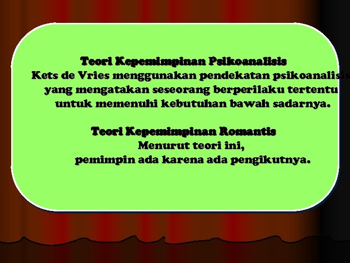 Teori Kepemimpinan Psikoanalisis Kets de Vries menggunakan pendekatan psikoanalisis yang mengatakan seseorang berperilaku tertentu untuk memenuhi kebutuhan bawah sadarnya. Teori Kepemimpinan Romantis Menurut teori ini, pemimpin ada karena ada pengikutnya.