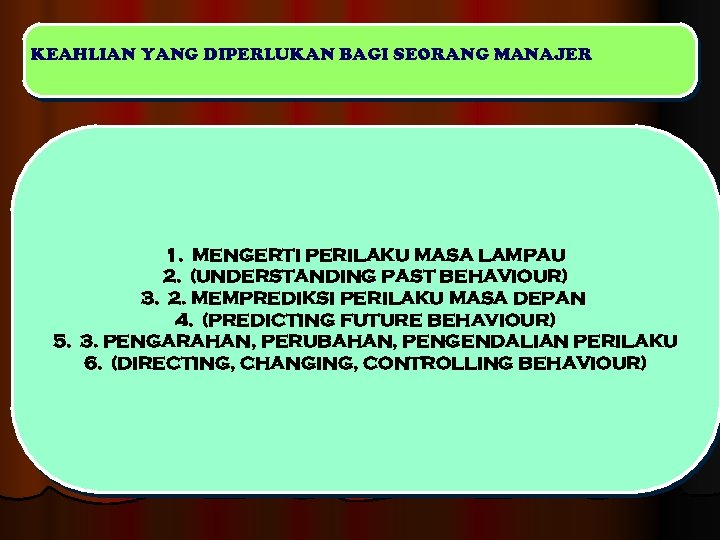 KEAHLIAN YANG DIPERLUKAN BAGI SEORANG MANAJER 1. MENGERTI PERILAKU MASA LAMPAU 2. (UNDERSTANDING PAST BEHAVIOUR) 3. 2. MEMPREDIKSI PERILAKU MASA DEPAN 4. (PREDICTING FUTURE BEHAVIOUR) 5. 3. PENGARAHAN, PERUBAHAN, PENGENDALIAN PERILAKU 6. (DIRECTING, CHANGING, CONTROLLING BEHAVIOUR)