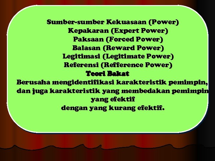 Sumber-sumber Kekuasaan (Power) Kepakaran (Expert Power) Paksaan (Forced Power) Balasan (Reward Power) Legitimasi (Legitimate Power) Referensi (Refference Power) Teori Bakat Berusaha mengidentifikasi karakteristik pemimpin, dan juga karakteristik yang membedakan pemimpin yang efektif dengan yang kurang efektif.