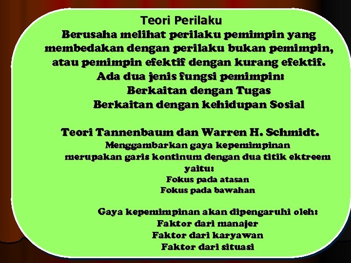 Teori Perilaku Berusaha melihat perilaku pemimpin yang membedakan dengan perilaku bukan pemimpin, atau pemimpin efektif dengan kurang efektif. Ada dua jenis fungsi pemimpin: Berkaitan dengan Tugas Berkaitan dengan kehidupan Sosial Teori Tannenbaum dan Warren H. Schmidt. Menggambarkan gaya kepemimpinan merupakan garis kontinum dengan dua titik ektreem yaitu: Fokus pada atasan Fokus pada bawahan Gaya kepemimpinan akan dipengaruhi oleh: Faktor dari manajer Faktor dari karyawan Faktor dari situasi