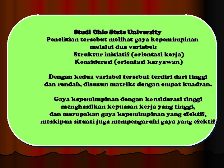 Studi Ohio State University Penelitian tersebut melihat gaya kepemimpinan melalui dua variabel: Struktur inisiatif (orientasi kerja) Konsiderasi (orientasi karyawan) Dengan kedua variabel tersebut terdiri dari tinggi dan rendah, disusun matriks dengan empat kuadran. Gaya kepemimpinan dengan konsiderasi tinggi menghasilkan kepuasan kerja yang tinggi, dan merupakan gaya kepemimpinan yang efektif, meskipun situasi juga mempengaruhi gaya yang efektif.