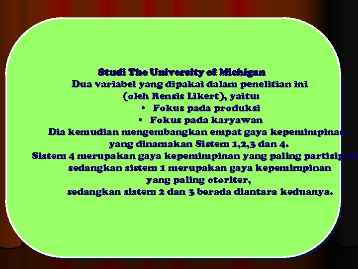 Studi The University of Michigan Dua variabel yang dipakai dalam penelitian ini (oleh Rensis Likert), yaitu: • Fokus pada produksi • Fokus pada karyawan Dia kemudian mengembangkan empat gaya kepemimpinan, yang dinamakan Sistem 1, 2, 3 dan 4. Sistem 4 merupakan gaya kepemimpinan yang paling partisipati sedangkan sistem 1 merupakan gaya kepemimpinan yang paling otoriter, sedangkan sistem 2 dan 3 berada diantara keduanya.