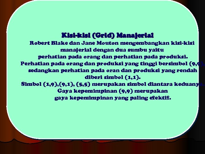 Kisi-kisi (Grid) Manajerial Robert Blake dan Jane Mouton mengembangkan kisi-kisi manajerial dengan dua sumbu yaitu perhatian pada orang dan perhatian pada produksi. Perhatian pada orang dan produksi yang tinggi bersimbol (9, 9), sedangkan perhatian pada oran dan produksi yang rendah diberi simbol (1, 1). Simbol (1, 9), (9, 1), (5, 5) merupakan simbol diantara keduanya. Gaya kepemimpinan (9, 9) merupakan gaya kepemimpinan yang paling efektif.