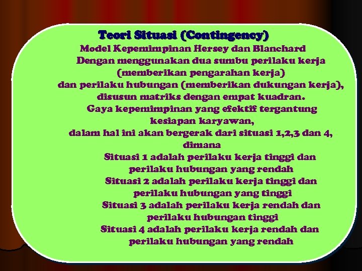 Teori Situasi (Contingency) Model Kepemimpinan Hersey dan Blanchard Dengan menggunakan dua sumbu perilaku kerja (memberikan pengarahan kerja) dan perilaku hubungan (memberikan dukungan kerja), disusun matriks dengan empat kuadran. Gaya kepemimpinan yang efektif tergantung kesiapan karyawan, dalam hal ini akan bergerak dari situasi 1, 2, 3 dan 4, dimana Situasi 1 adalah perilaku kerja tinggi dan perilaku hubungan yang rendah Situasi 2 adalah perilaku kerja tinggi dan perilaku hubungan yang tinggi Situasi 3 adalah perilaku kerja rendah dan perilaku hubungan tinggi Situasi 4 adalah perilaku kerja rendah dan perilaku hubungan yang rendah