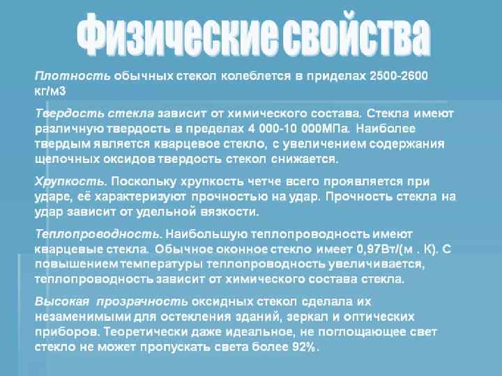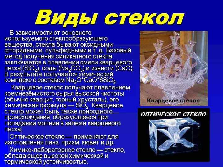 Сейчас в мире существует огромное количество различных стёкол, отличающихся друг от друга своим видом, составом и свойствами.