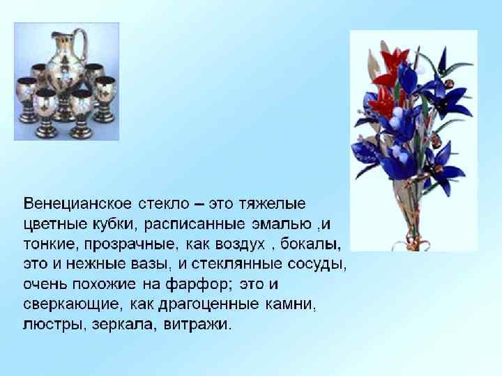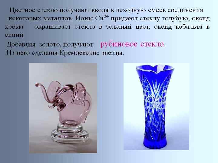 ü При введении в силикатное стекло соединений свинца получают свинцовый хрусталь – стекло, сильно преломляющее свет и хорошо полирующееся; оно более легкоплавко и медленнее затвердевает, что даёт возможность художнику стеклодуву изготовлять из него красивые изделия. ü Кальциево-натриевые (известково-натриевые) стёкла применяют в производстве оконного стекла, стеклянной тары, бутылок.