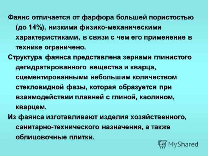 Керамика- изделия и материалы, получаемые спеканием. Искусство керамики насчитывает несколько тысячелетий. Сейчас в мире нет ни одного человека, который не был бы обладателем изделий из керамики. Наши дома построены из кирпича. Мы пьём и едим из фарфоровой или фаянсовой посуды, любуемся великолепными керамическими вазами в музеях; мы пользуемся кухнями, облицованными керамической плиткой; повреждённые кости и зубы заменяют керамическими протезами; металлургические печи изнутри выложены керамическими огнеупорами.